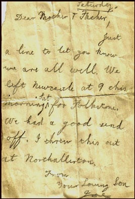 Just a line to let you know we are all well. We left Newcastle at 9 this morning, sat, for Folkestone. We had a good send off. I threw this out at Northallerton.