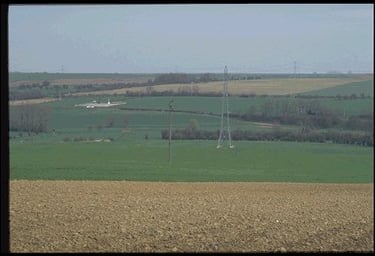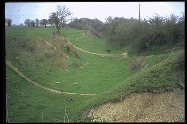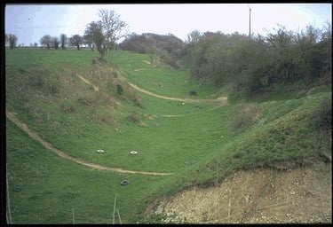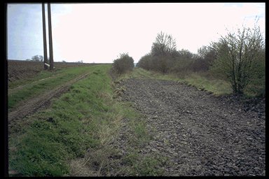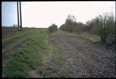 This photo is taken looking along the line of the old railway, which ran in the gap between the bushes just right of centre (not along the present farm track to the left of the bushes). When I visited the site in 1997 there were still a few old railway sleepers hidden in the undergrowth. The railway marked the position of the main German line, which was heavily wired. The KRRC's attacked up the slope from right to left in this photo.
