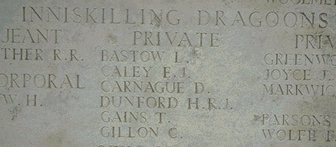 At some point during the war he joined the 6th (Inniskilling) Dragoons, with whom he was killed, aged 36, during the last great German offensive on the Somme of March/ April 1918. He met his death on 2nd April 1918 defending Rifle Wood near Hourges, France, which had been captured by the Canadian Cavalry Brigade earlier that morning. Sadly his body was never identified and his name is inscribed on the Memorial to the Missing near Pozieres which lists all those Allied soldiers who lost their lives in the Somme area in 1918 and who have no known grave.