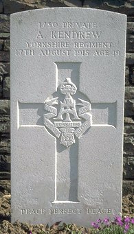 On 16th August the 4th Yorkshires relieved the 5th Durham Light Infantry in Trenches 71, 72 and 73 in the British Front line near Armentieres. On the following day, nineteen year old Pte. Kendrew was working as a Medical Orderly when he was killed, presumably by a German sniper, as he stole a look over the trench parapet.