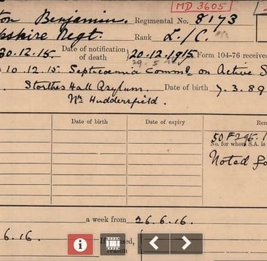 He had been a soldier before the outbreak of War in 1914, having enlisted in the Yorkshire Regiment in September 1905, just before his 19th birthday. At the time of his enlistment he was described as being 5ft 6ins tall with fair hair and light blue eyes. He was working as an ironmonger's assistant in his father's shop, and his record states that he was "rather knock-kneed". His entry in the enlistment register also states that he was "discharged by purchase". This entry seems strange as he did not leave the army until 1913, but if it is correct, it was clearly not money well spent. Like all recent ex-soldiers, Benjamin was on the Reserve List when War was declared in August 1914 and was therefore recalled into the Army after only 18 months of civilian life. During his previous Army career he had served in South Africa, Egypt and India.
