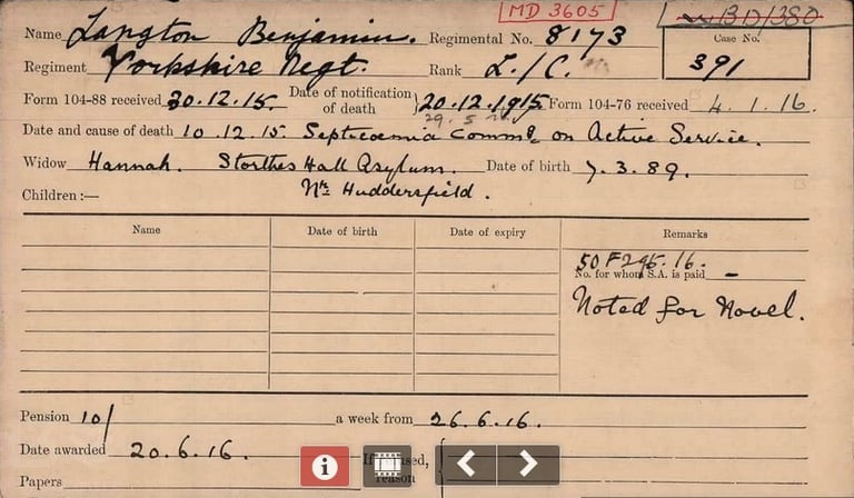 On Benjamin's Pension Record Card (shown above), which appears to date from June 1916, his wife, Hannah, is shown to be living in Storthes Hall Asylum, near Huddersfield, though it is not clear whether or not she was there as an inmate or as a member of staff.