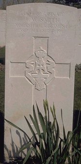 He met his death in the remains of the village of Potijze, just outside Ypres, while he was serving with the Battalion's Quartermasters Stores. He was sitting at a fire when the village was bombed by enemy planes and a piece of shrapnel struck him in his back. He was buried in a nearby cemetery which had grown up around a dressing station which had been established in the grounds of Potijze Chateau.